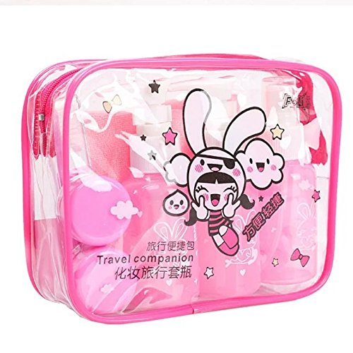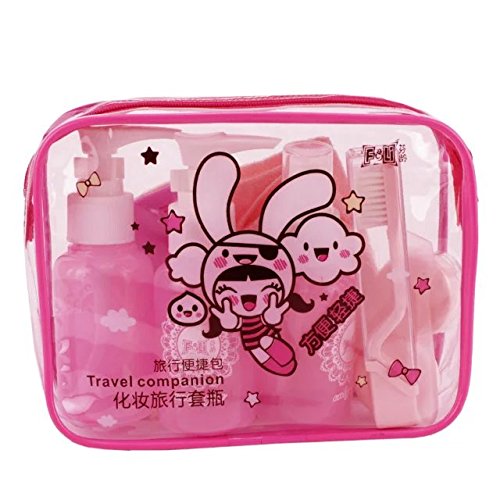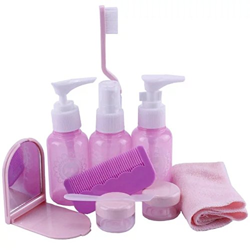 Material: PET Color Package of: pink: bottle of pump 2x 75ml, spray of 1x75ml, box of cream of 2x 15g, 1x toothbrush of mosaic, 1x mirror, 1x small comb of hair, 1x spoon with mask, 1xSallall washcloth, 1xTransparent Bags